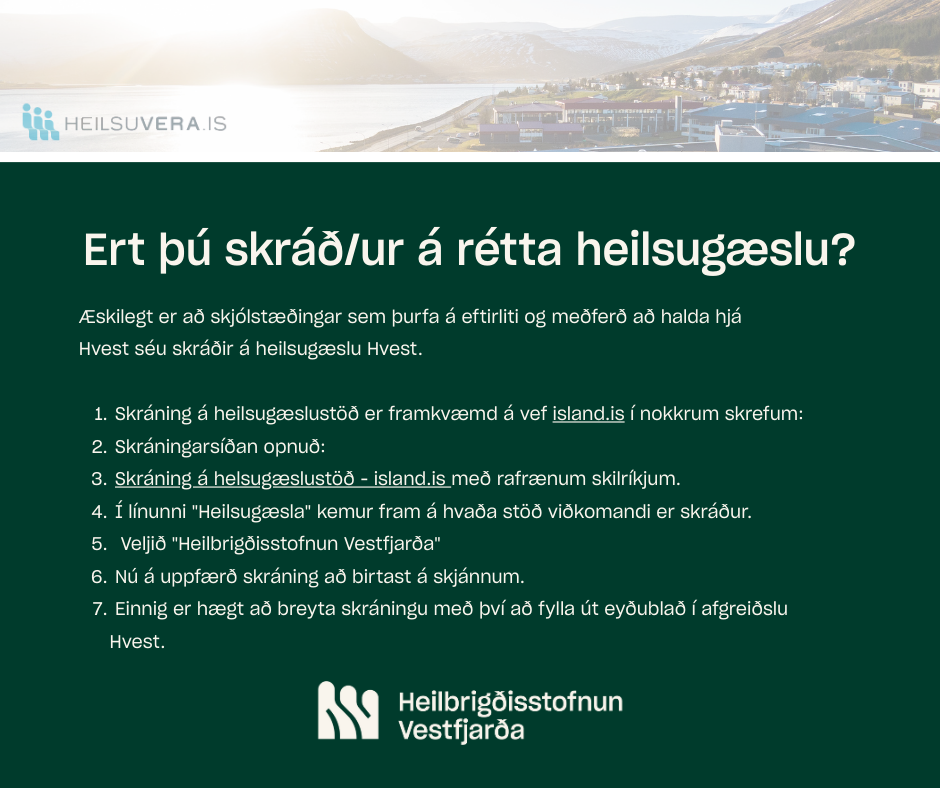 Æskilegt er að skjólstæðingar sem þurfa á eftirliti og meðferð að halda hjá Heilbrigðisstofnun Vestfjarða séu skráðir á heilsugæslu Hvest.